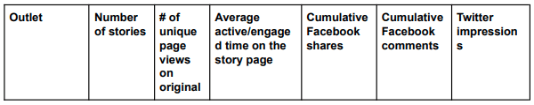 For social distribution results, we searched Meltwater’s social feature using the same search terms as well as the first sentence of each story. Additionally, we searched for social captures from each story through the CrowdTangle browser extension.